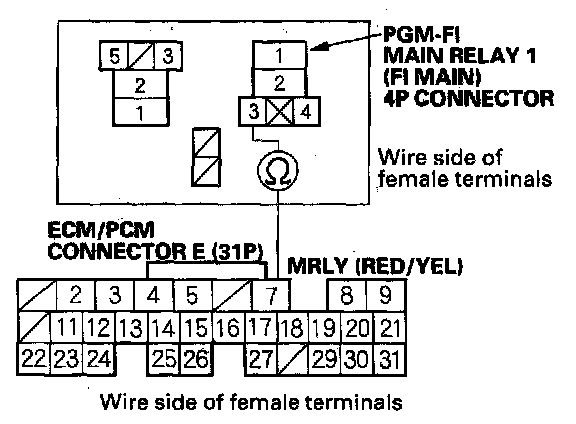 30. Check for continuity between body ground and PGM-FI main relay 1 (FI MAIN) 4P connector terminals No. 2 and No. 4 individually.