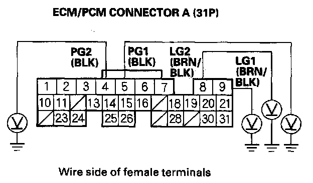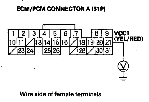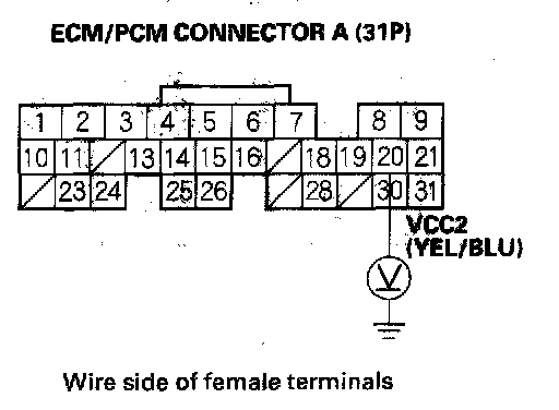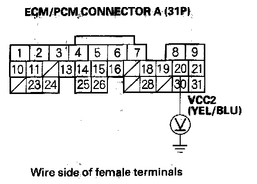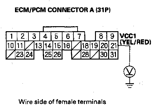 76. Disconnect the connector from each of these sensors, one at a tune, and measure voltage between body ground and ECM/PCM connector terminal A20 with the ignition switch ON (II).