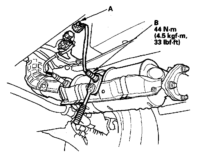 1. Disconnect the secondary HO2S 4P connector (A), then remove the secondary HO2S (B).