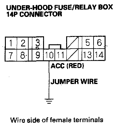 9. Momentarily connect under-hood fuse/relay box 14P connector terminal No. 10 to body ground with a jumper wire several times.