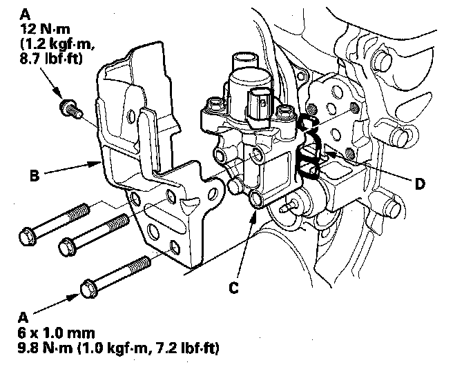 3. Install the valve in the reverse order of removal with a new rocker arm oil control solenoid (VTEC solenoid valve) filter (D)