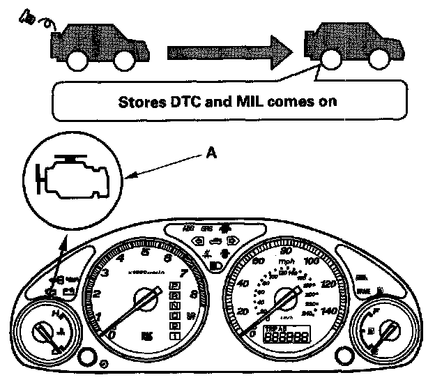 During the third drive cycle after a cold start, if the fuel fill cap is still loose or missing, the ECM/PCM stores DTC P0457 "Evaporative Emission (EVAP) System Leak Detected/Fuel Fill Cap Loose or Missing". The malfunction indicator lamp (MIL) (A) comes on, and the "CHECK FUEL CAP" message goes off.