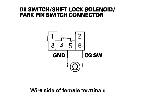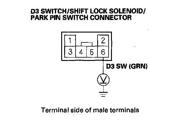 7. Check for continuity between D3 switch/shift lock solenoid/park pin switch connector terminal No. 5 and No. 6.