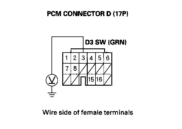11. Measure the voltage between PCM connector terminal D3 and body ground.