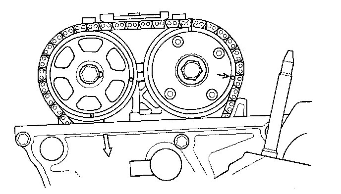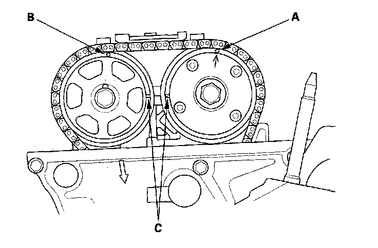 2. Set the No. 1 piston at top dead center (TDC). The punch mark (A) on the variable valve timing control (VTC) actuator and the punch mark (B) on the exhaust camshaft sprocket should be at the top. Align the TDC marks (C) on the VTC actuator and exhaust camshaft sprocket.
