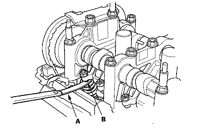 4. Insert the feeler gauge (A) between the adjusting screw (B) and the end of the valve stem, and slide it back and forth; you should feel a slight amount of drag.