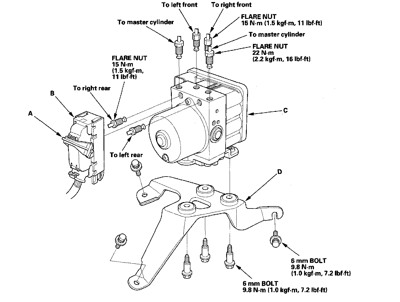 3. Remove the three 6 mm bolts, then remove the VSA modulator-control unit (C)/bracket (D) from the body.