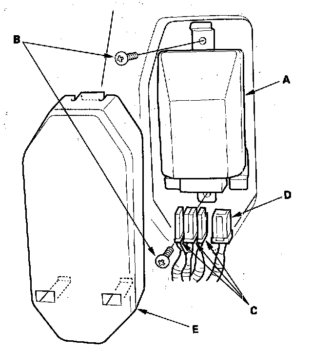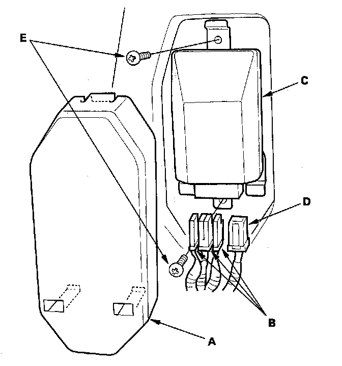1. Place the new OPDS unit (A) on the seat-back frame. Tighten the two screws (B), and connect the OPDS unit harness 8P connector D and sensor connectors (C) to the OPDS unit. Reinstall the cover (E).