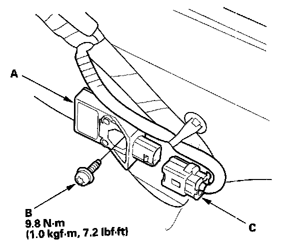 1. Install the new side impact sensor (first) (A) with a Torx bolt (B), then connect the floor wire harness 2P connector (C) to the side impact sensor (first).