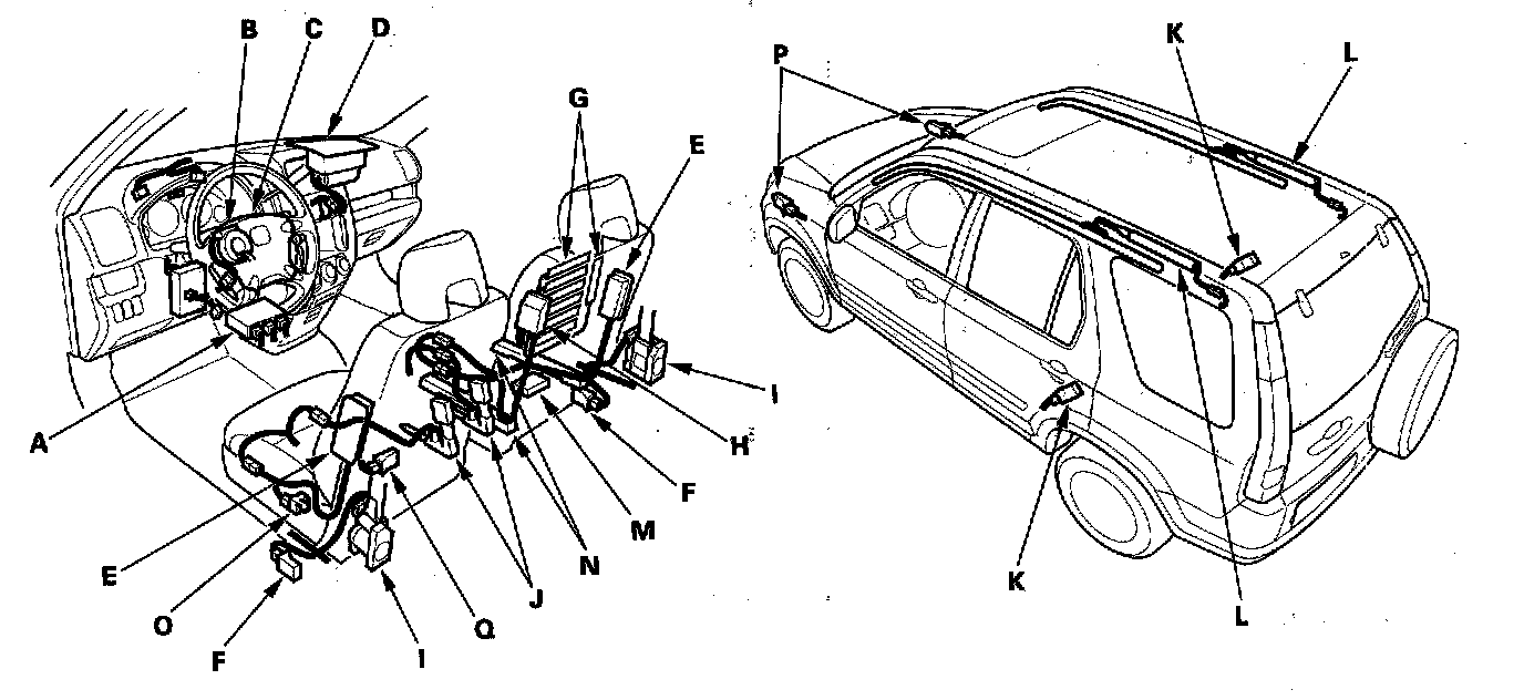 The SRS is a safety device which, when used with the seat belt, is designed to help protect the driver and front passenger in a frontal impact exceeding a certain set limit. The system consists of the SRS unit, including sating sensor and impact sensor (A), the cable reel (B), the driver's airbag (C), the front passenger's airbag (D), side airbags (E), side curtain airbags (L), seat belt tensioners (I),seat belt buckle tensioners (J), side impact sensors (first) (F), front impact sensors (P), roll rate sensor (Q) and side impact sensors (second) (K). Since the driver's and front passenger's airbags use the same sensors, both normally inflate at the same time. However, it is possible for only one airbag to inflate. This can occur when the severity of a collision is at the margin, or threshold, that the SRS unit determines whether or not the airbags will deploy. In such cases, the seat belt will provide sufficient protection, and the supplemental protection offered by the airbag would be minimal.