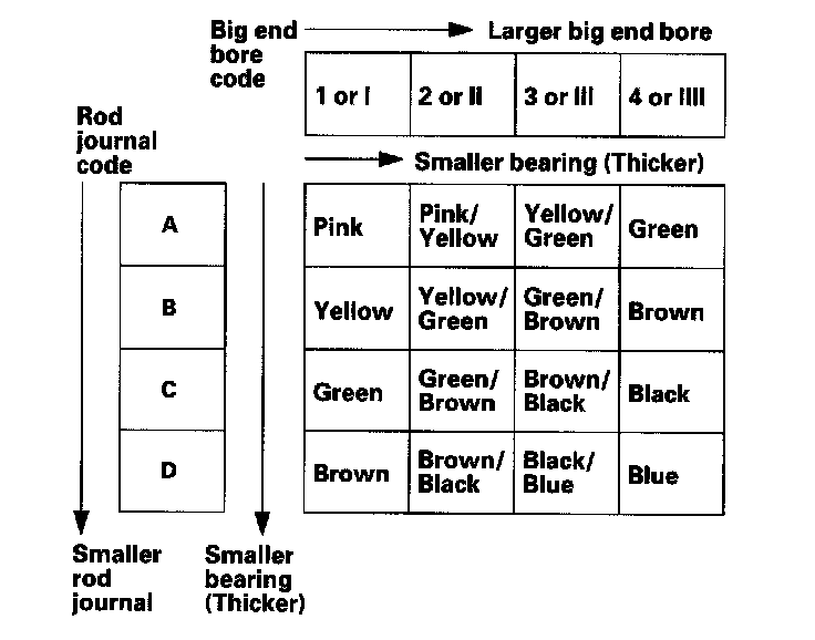 Use the big end bore codes and rod journal codes to select appropriate replacement bearings from the table.