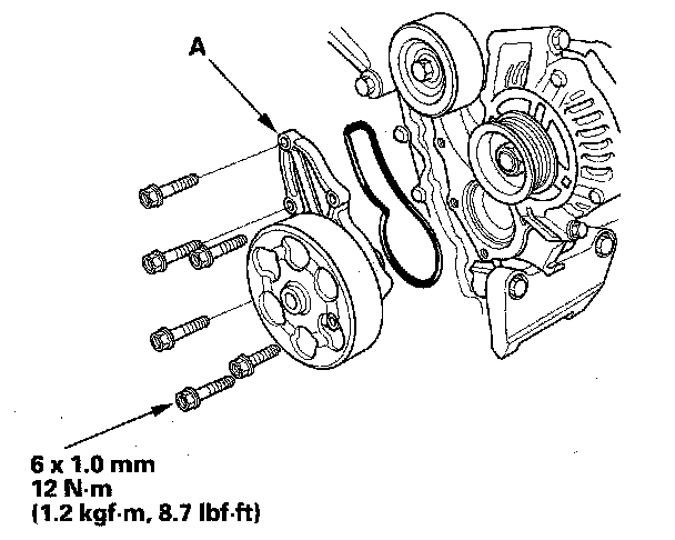 Install the six bolts securing the water pump, then install the water pump (A) with new O-rings.