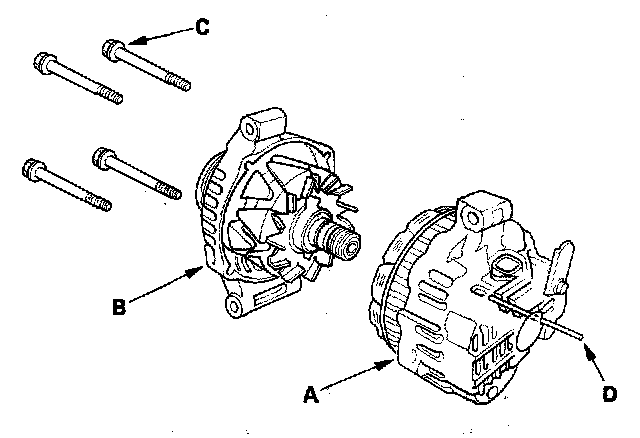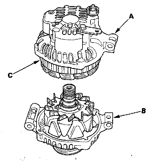 6. Separate the rear housing (A) and drive-end housing (B) with the stator (C) attached to the rear housing.