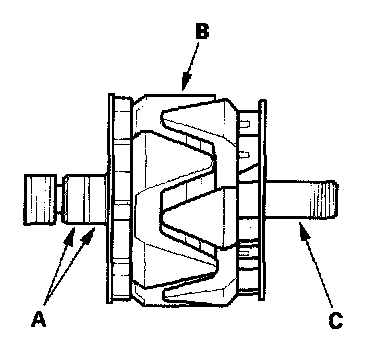 17. Check for continuity between each slip ring and the rotor (B) and the rotor shaft (C).