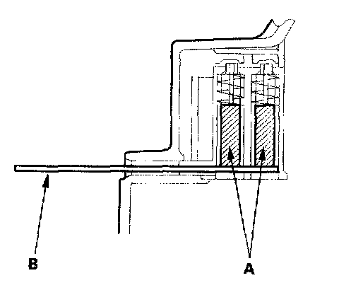 20. Push in the brushes (A), then insert a pin or drill bit (B) (about 1.8 mm (0.77 in.) diameter) to hold them there.