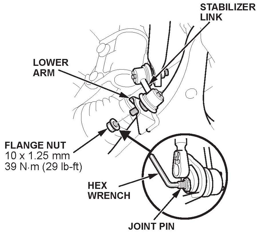 2. Disconnect the stabilizer link from the lower control arm by holding the joint pin with a hex wrench, then removing the flange nut.