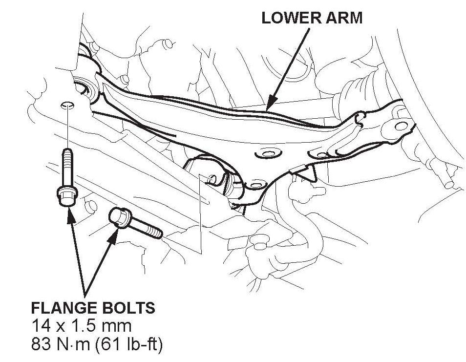 10. Raise the suspension with a floor jack to load it with the vehicle's weight. Don't place the jack on the lower control arm ball joint. Torque the flange nut and bolts.