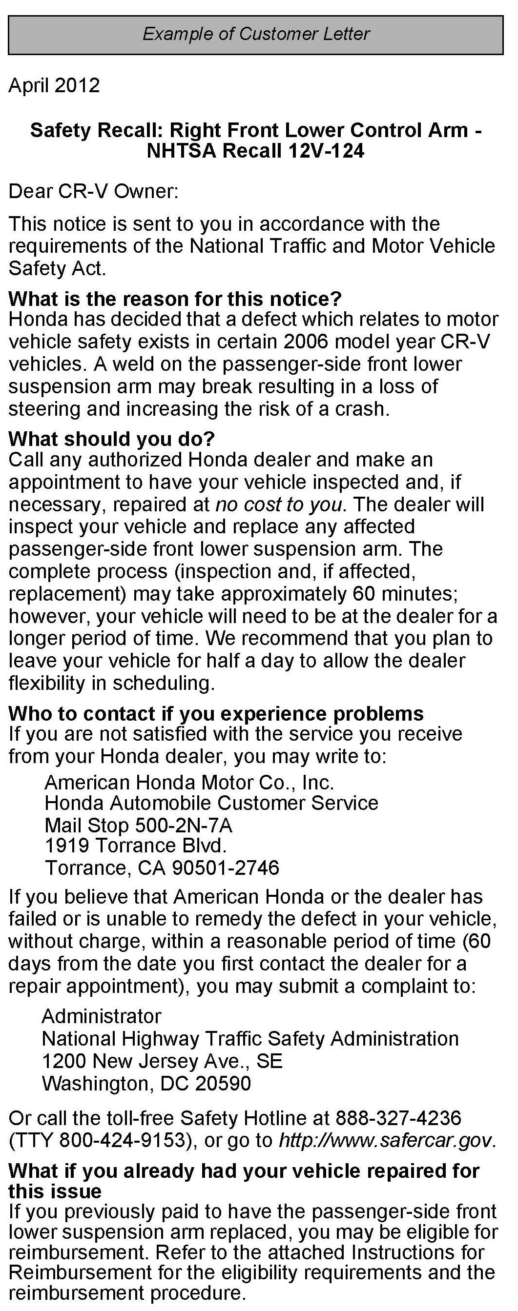 ^ An example of the customer letter was included.*
