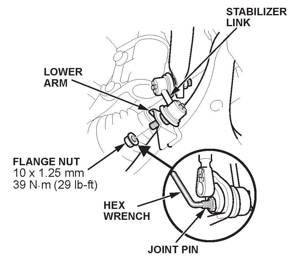 2. Disconnect the stabilizer link from the lower control arm by holding the joint pin with a hex wrench, then removing the flange nut.