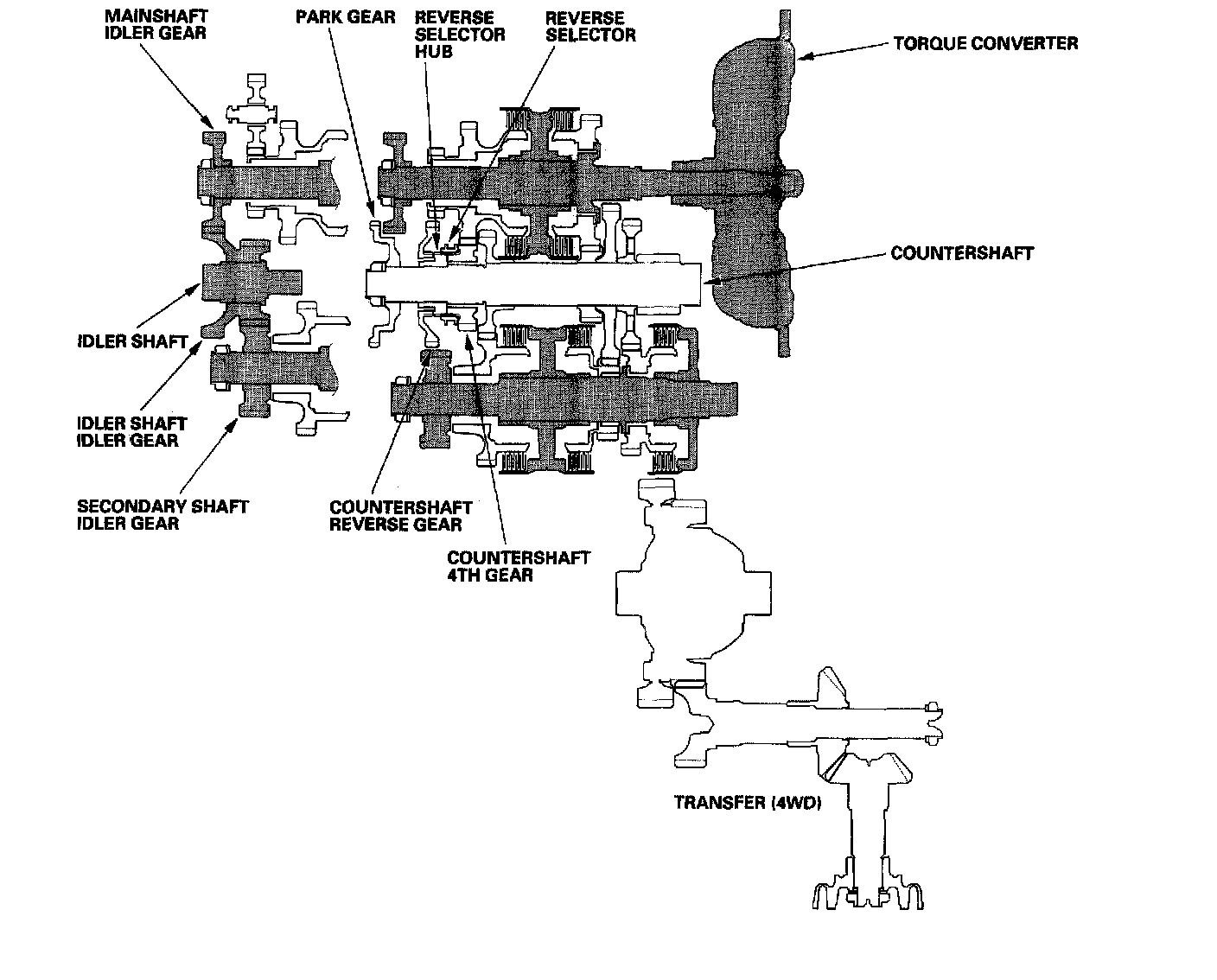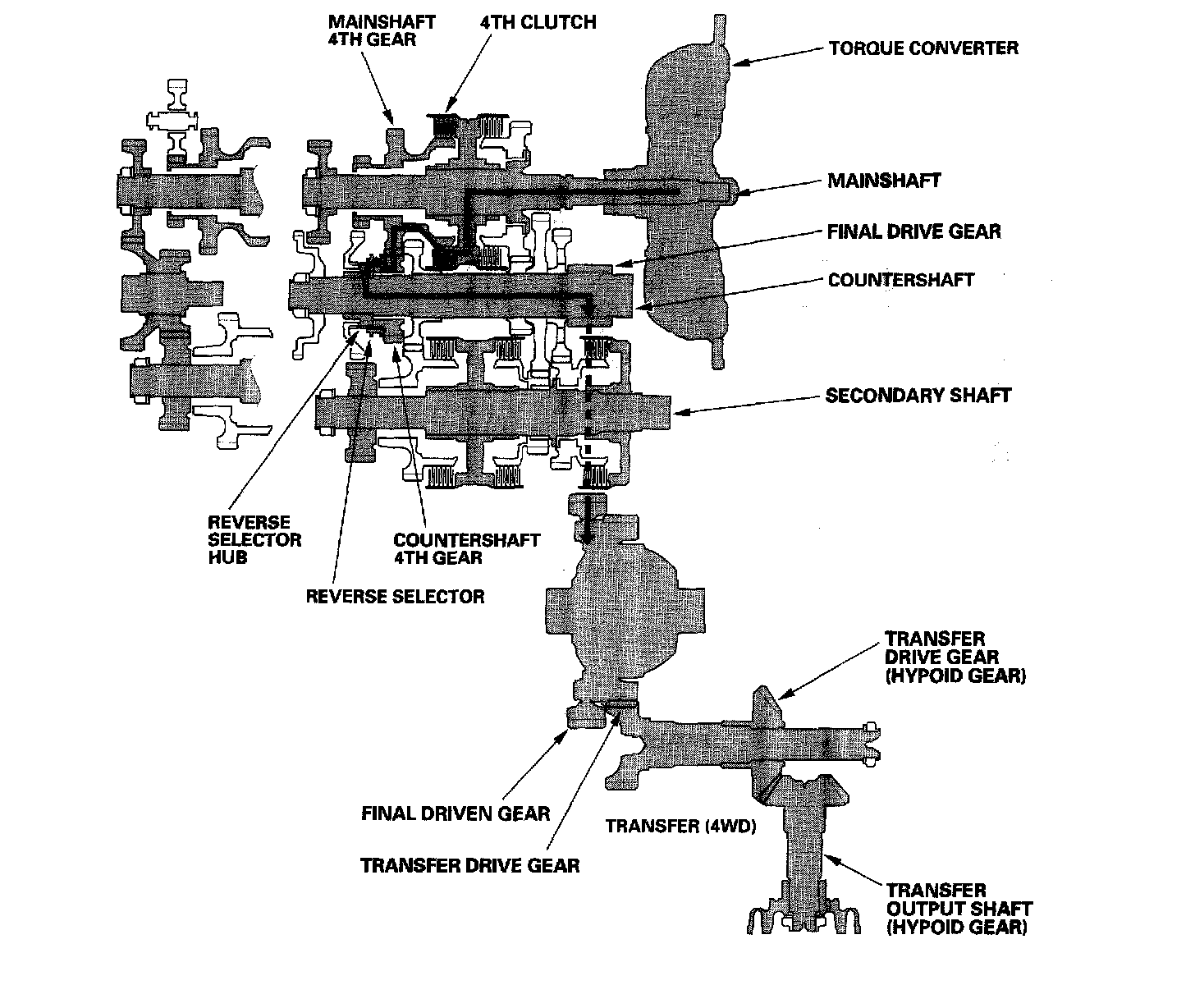 Engine power transmitted from the torque converter drives the mainshaft idler gear, the idler shaft idler gear, and the secondary shaft idler gear, but hydraulic pressure is not applied to the clutches. Power is not transmitted to the countershaft. In this position, the position of the reverse selector differs according to whether the shift lever shifted from the D or R position: