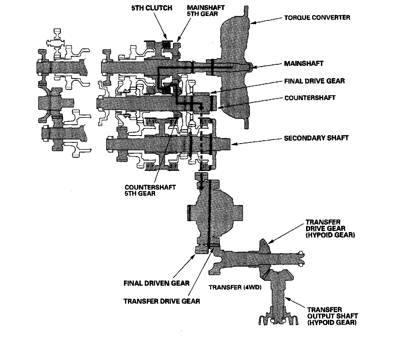 ^ Hydraulic pressure is applied to the 5th clutch, then the 5th clutch engages the mainshaft 5th gear with the mainshaft.
