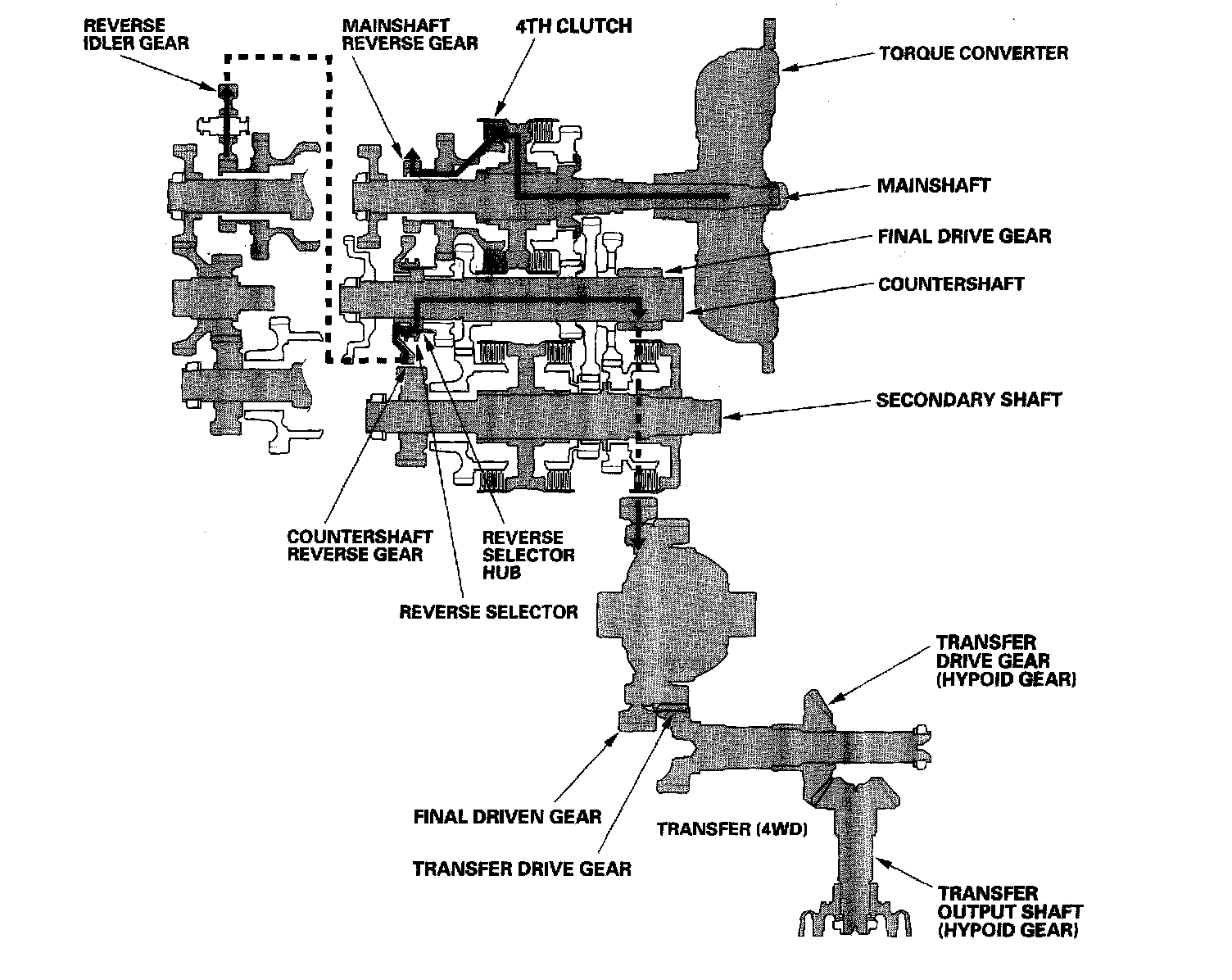 ^ Hydraulic pressure is also applied to the 4th clutch, then the 4th clutch engages the mainshaft reverse gear with the mainshaft.