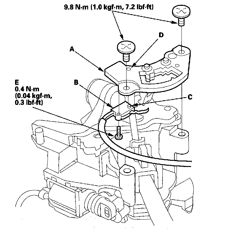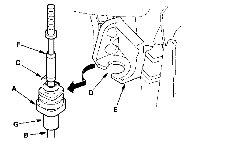 8. Rotate the socket holder (A) on the shift cable (B) a quarter turn; the tab (C) on the socket holder will be in the opening (D) of the socket holder bracket (E). Then slide the holder to remove the shift cable from the socket holder bracket.