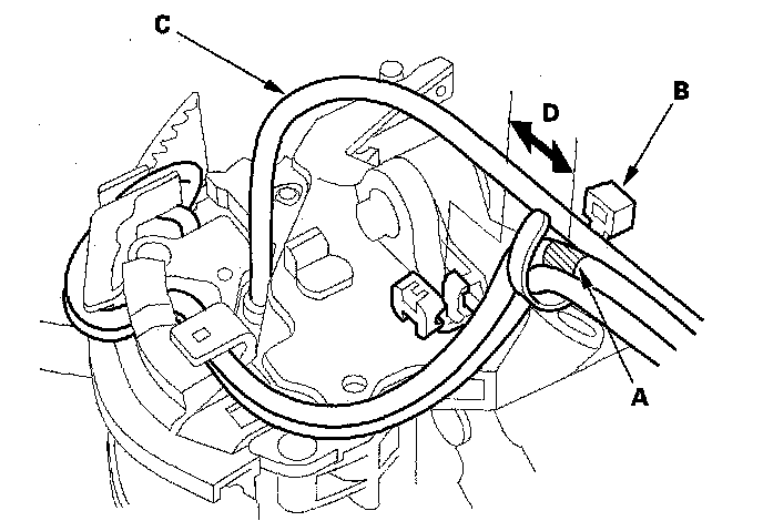 21. Align the marks (A) on the harnesses, and tie the harness band (B) over the marks. Clamp the D3 switch harness (C) 15 mm (0.6 inch) (D) from the harness band.