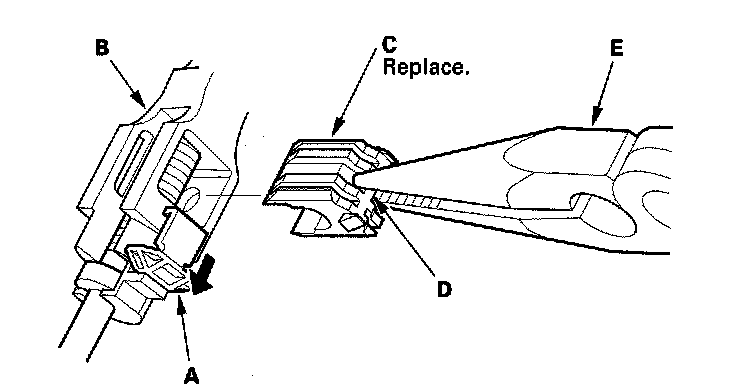 5. Grasp the shift cable lock (C) in the middle (D) with needle-nose pliers (E), and remove it from the shift cable end and shift cable end holder.
