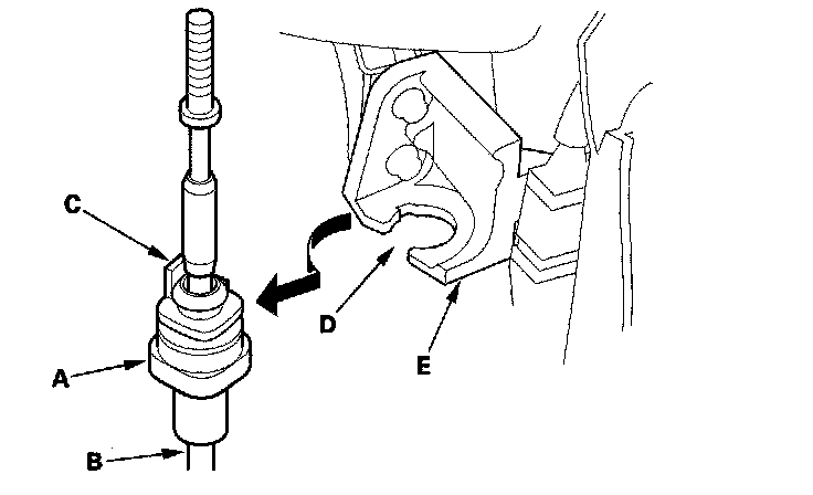 7. Rotate the socket holder (A) on the shift cable (B) a quarter turn; the tab (C) on the socket holder will be in the opening (D) of the socket holder bracket (E). Then slide the holder to remove the shift cable from the socket holder bracket.