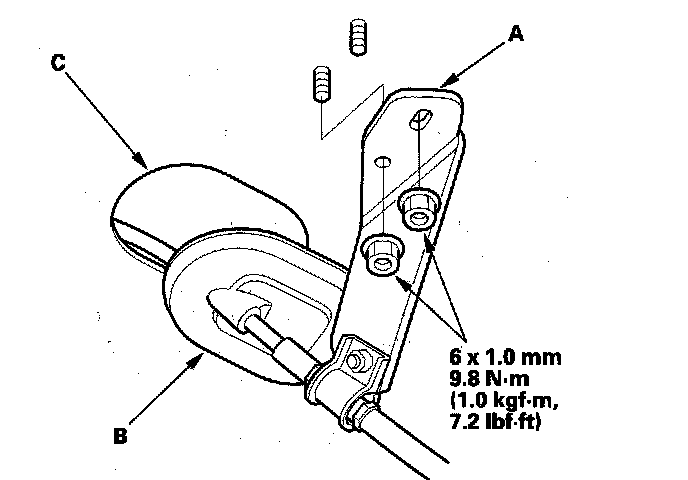 11. Install the shift cable bracket (A) on the body, then install the grommet (B) in its hole (C).