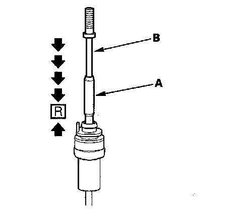 13. If necessary, push the shift cable until it stops, then release it. Pull the shift cable back one step so that the shift cable is in R. Do not hold the shift cable guide (A) to adjust the shift cable (B).