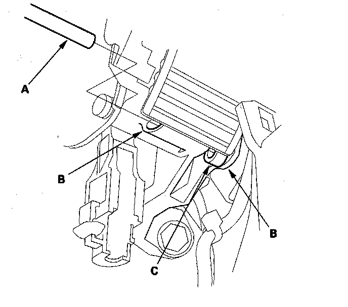 15. Insert a 6.0 mm (0.24 inch) pin (A) into the positioning holes (B) on the shift lever bracket base and through the positioning hole (C) on the shift lever. The shift lever is secured in the R position.