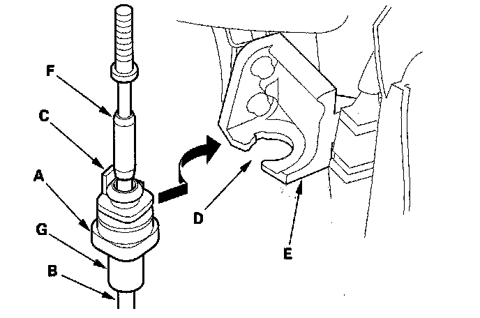 16. Rotate the socket holder (A) on the shift cable (B) to face the tab (C) on the holder opposite to the opening (D) in the socket holder bracket (E). Align the holder with the opening in the bracket, then slide the holder into the bracket. Rotate the holder a quarter turn to secure the shift cable. Do not install the shift cable by twisting the shift cable guide (F) and damper (G).