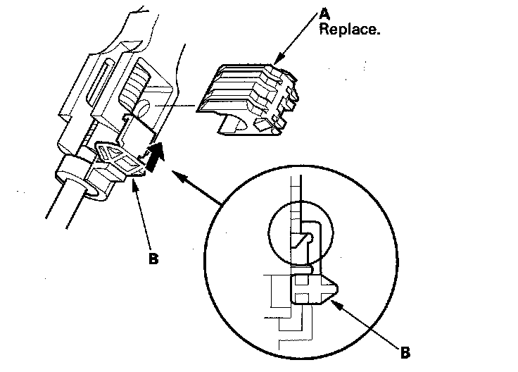18. Install the new shift cable lock (A) to secure the shift cable end and shift cable end holder, then push the lock tab (B) up until it stops to lock the joint.