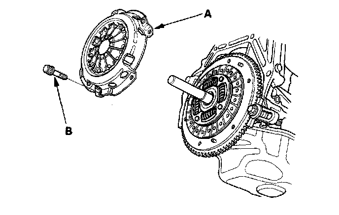 3. To prevent warping, unscrew the pressure plate mounting bolts (A) in a crisscross pattern in several steps, then remove the pressure plate (B).