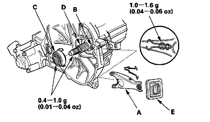 2. Remove the release fork (C) from the clutch housing by squeezing the release fork set spring (D) with pliers. Remove the release bearing (E).