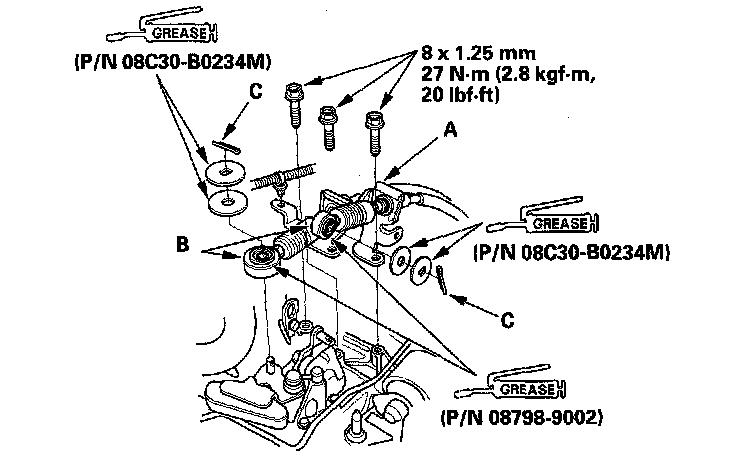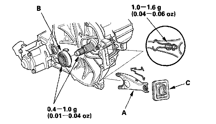 2. Apply super high temp urea grease (P/N 08798-9002) to the release fork (A) and the release bearing (B). Install the release fork, the release bearing, and the boot (C).