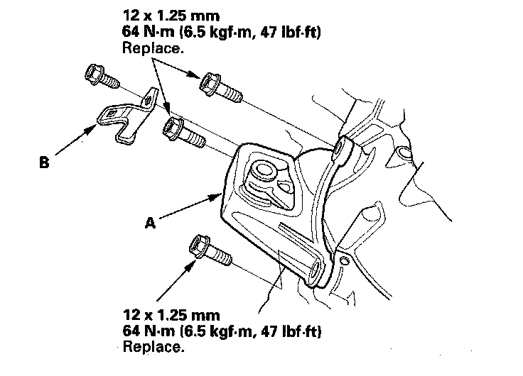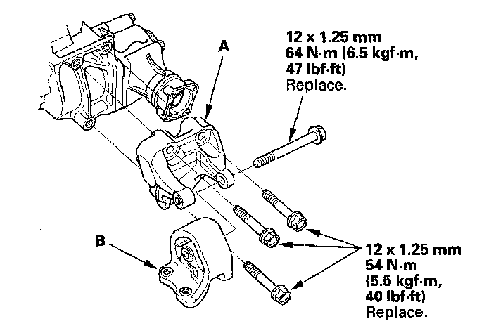 3. Install the transmission rear mount bracket (A) and the transmission rear mount (B).
