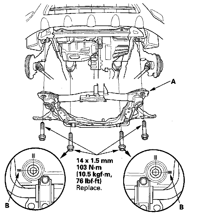 11. Install the front suspension subframe (A) in its original position by aligning it with the marks (B) you made in the removal procedure.