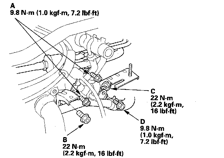 23. Install the brake booster, the evaporative emission (EVAP) line bracket mounting bolts (A), and the air cleaner housing bracket mounting bolt (B). Tighten the air cleaner housing bracket mounting bolt (C), and install the water pipe mounting bolt (D).
