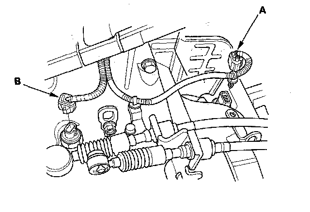 28. Connect the vehicle speed sensor (VSS) connector (A) and the back-up light switch connector (B).