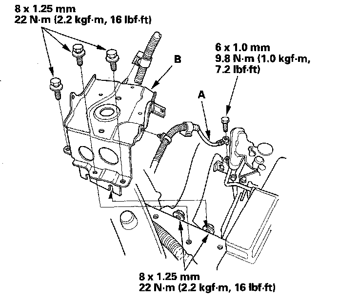 17. Install the transmission mount bracket (A) and the transmission mounting bolt (B).