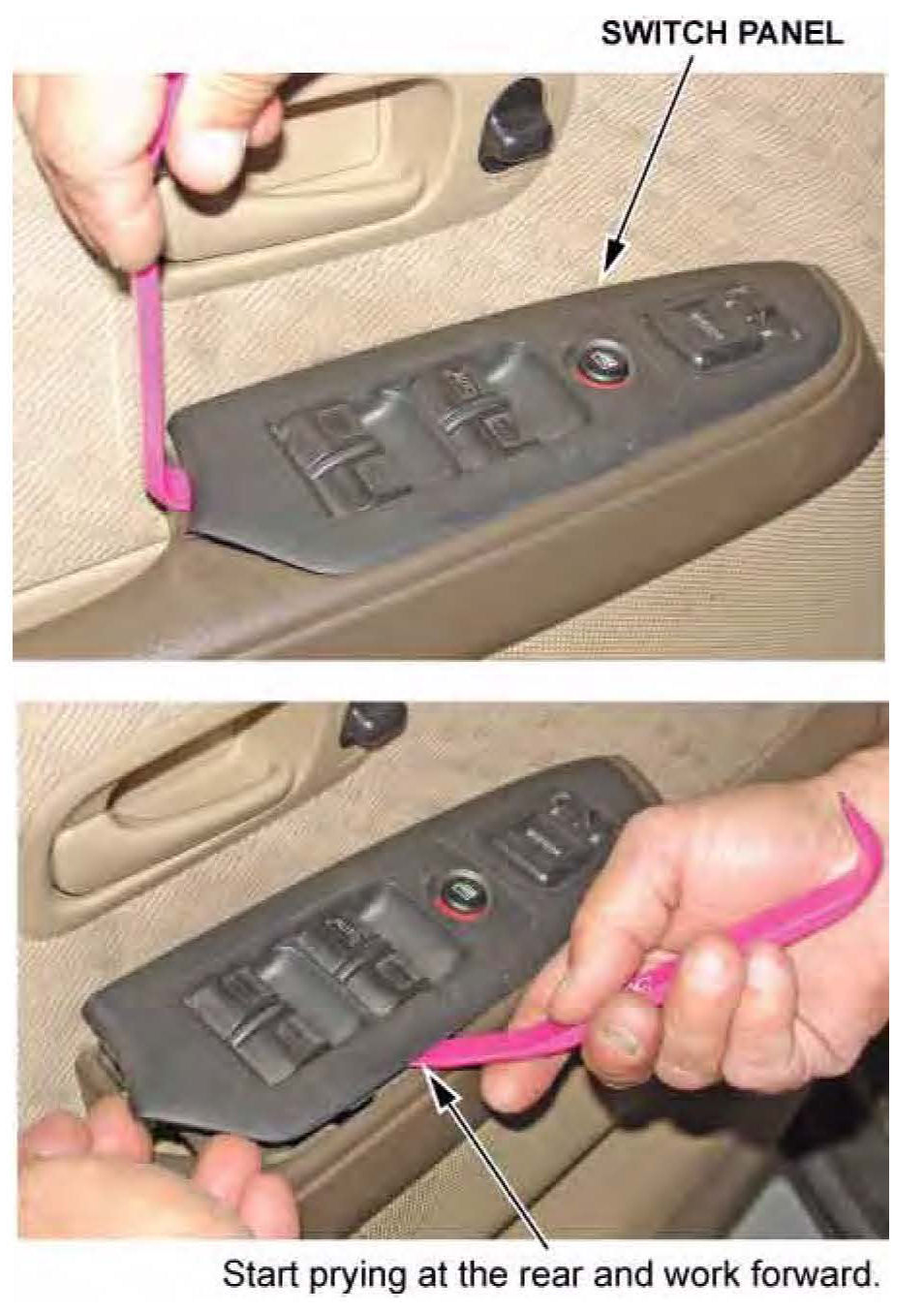 1. Using the appropriate trim tool, start prying at the rear of the driver's switch panel and move forward to release the hooks.