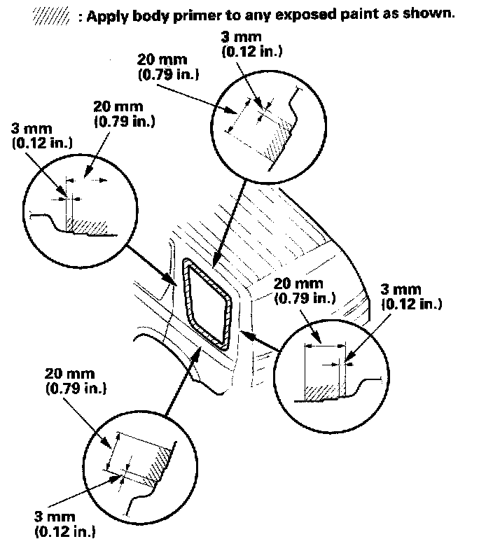 12. With a sponge, carefully apply a light coat of body primer to any exposed paint or metal around the flange where new adhesive will be applied. Let the body primer dry for at least 10 minutes;