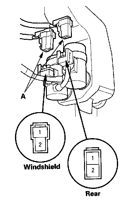 3. Test the motor by connecting battery power to the No. 1 terminal and ground the No. 2 terminal of the washer motor. The motor should run.