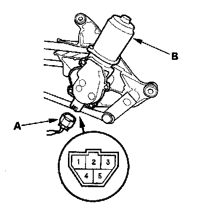 2. Disconnect the 5P connector (A) from the wiper motor (B).
