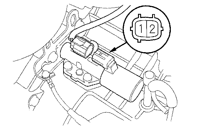 14. Connect the battery positive terminal to A/T clutch pressure control solenoid valve connector terminal No. 1, and connect the battery negative terminal to the terminal No. 2. Make sure the A/T clutch pressure control solenoid valve moves.