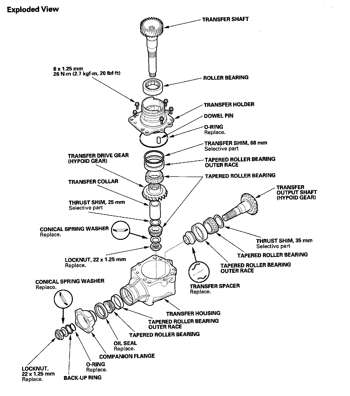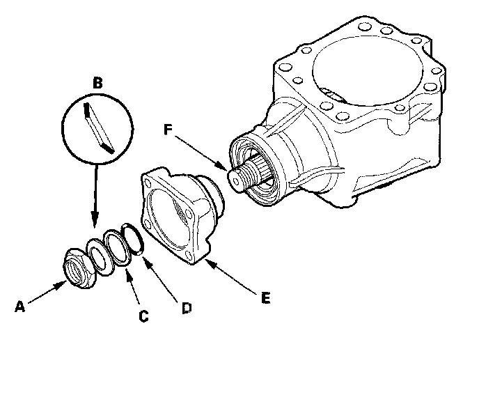 6. Remove the locknut (A), conical spring washer (B), back-up ring (C), O-ring (D), and companion flange (E) from the transfer output shaft (F).