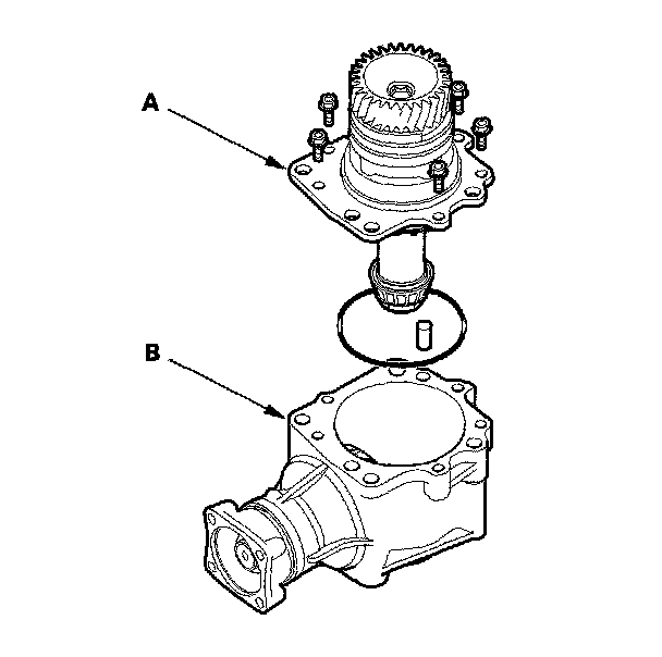 3. Secure the transfer housing (A) in a bench vise (B) with soft jaws. To prevent damage to the transfer housing, always use soft jaws or equivalent materials between the transfer housing and the vise.